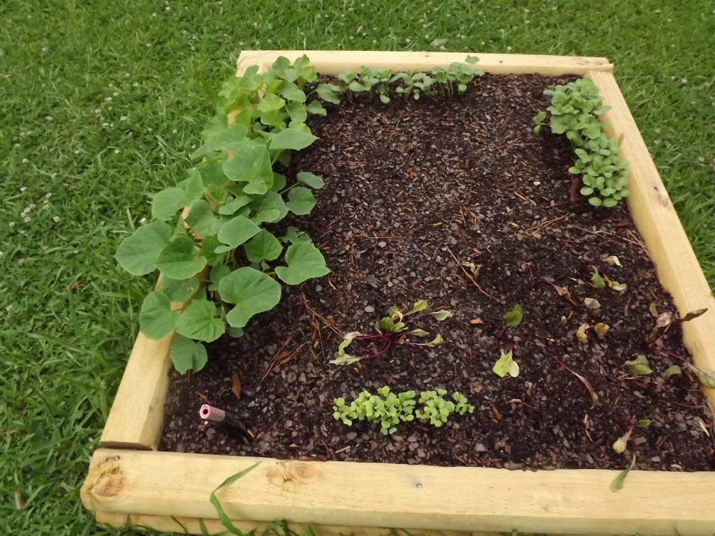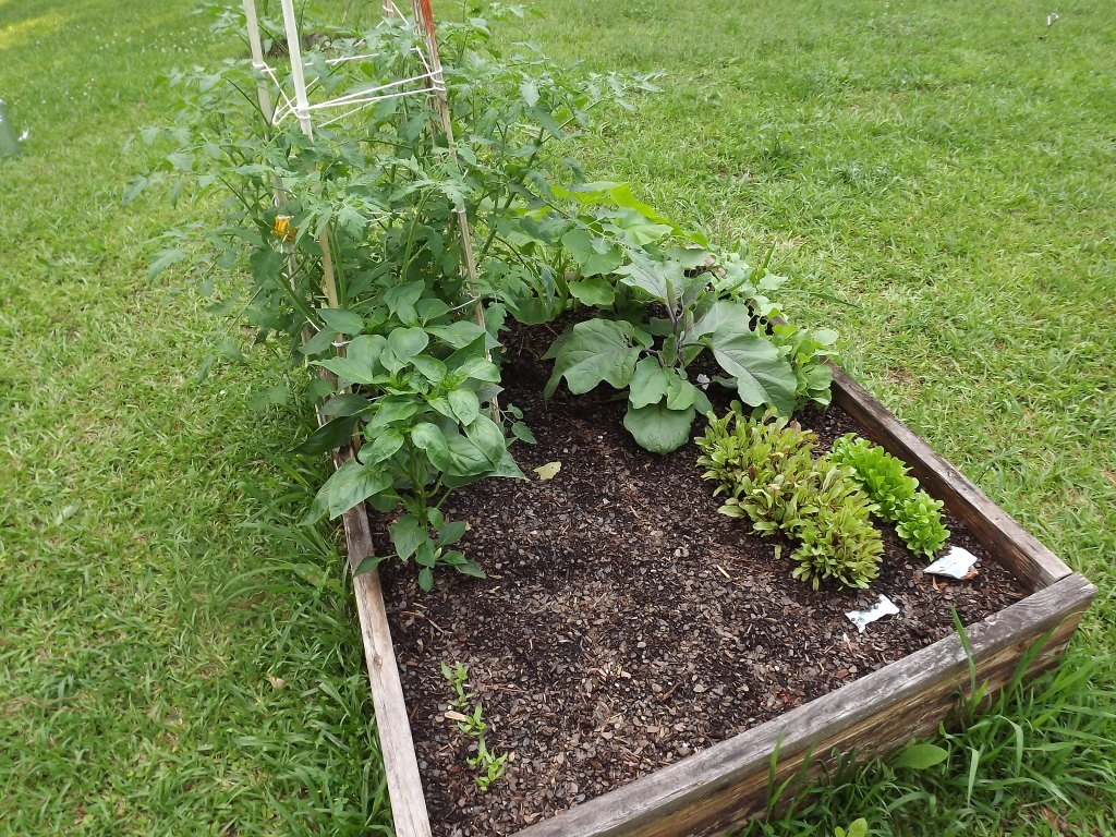 About a moth ago we started our first raised bed garden. My husband and I have never done much gardening so this was a new venture. We built the first 4×4 frame with an aging piece of 2×6 lumber that we had just laying around. After a trip to Tractor Supply, we came back with 8 bags of Miracle Grow Garden Soil. This stuff is great because it already has fertilizer in it. We filled it to the top and then began our planting. Some were plants and some were from seeds. These are photos of our first garden.