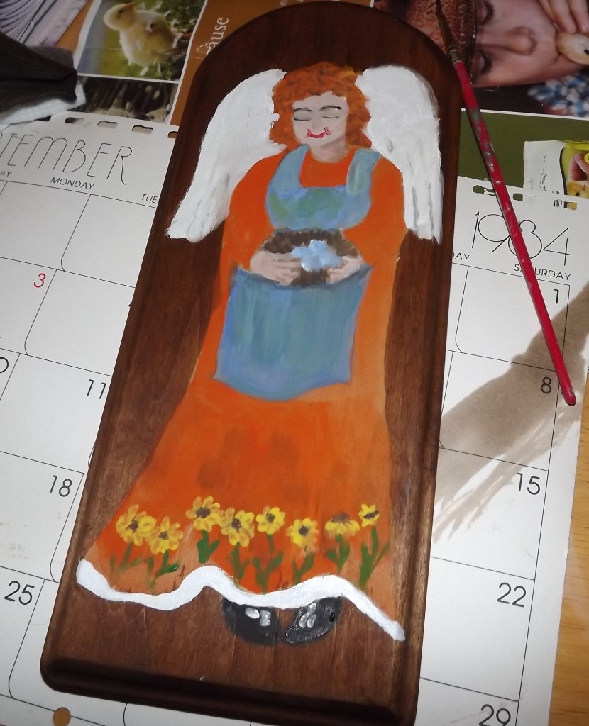 As you can see, this Garden Angel is simple in appearance but represents the Folk Art style. I chose here because I am learning to garden and I am a spiritual person. In her hands is a nest of eggs and she shows off her flowers at the bottom of her dress.