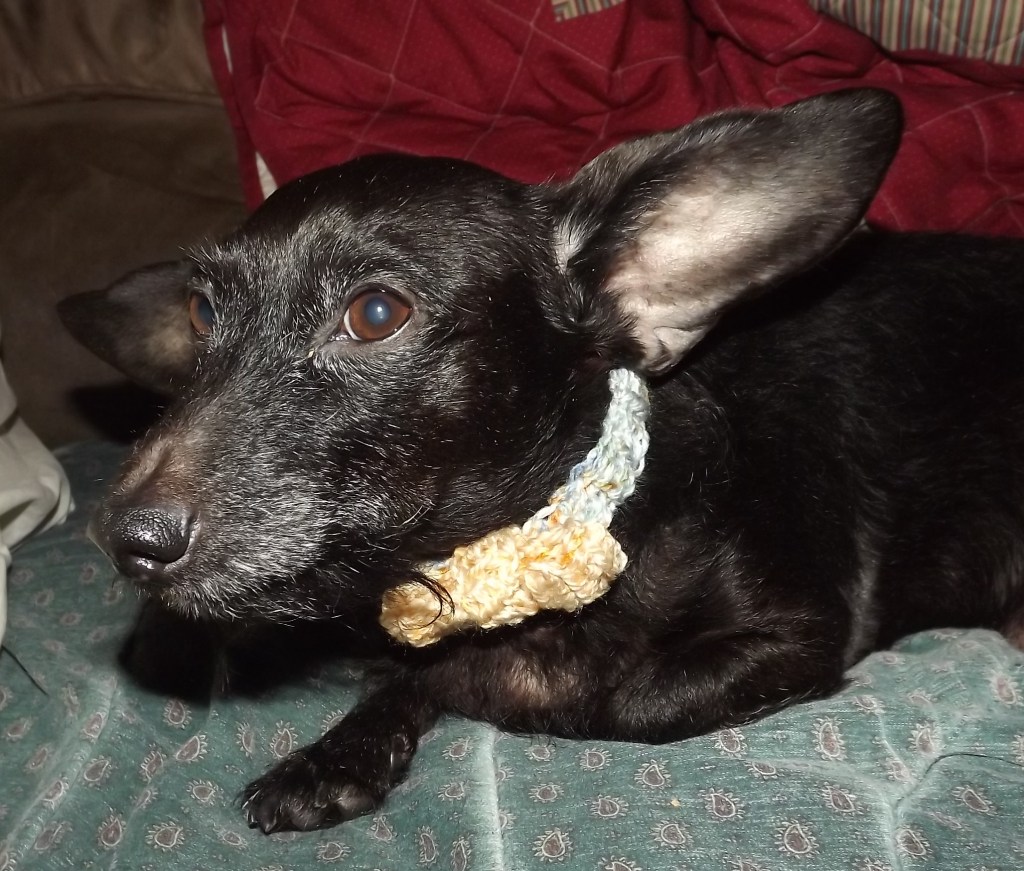 If you love to crochet this is very easy. You first need to know your dog’s neck size. Then with a G hook half double crochet the band with 4 stitches across. You can do the band in one length or do two half lengths and add velcro. For the bow make two short lengths (I did the bow in a contrasting color to make it “pop”.) one at least 4″ and stitch end to end. The other a longer piece to make the actual bow part 6″ or longer or to desired length. Stitch the longer piece toghether first then place the 4″ band around the longer piece and the neckband. Walla! You now have a neckband bow-tie!