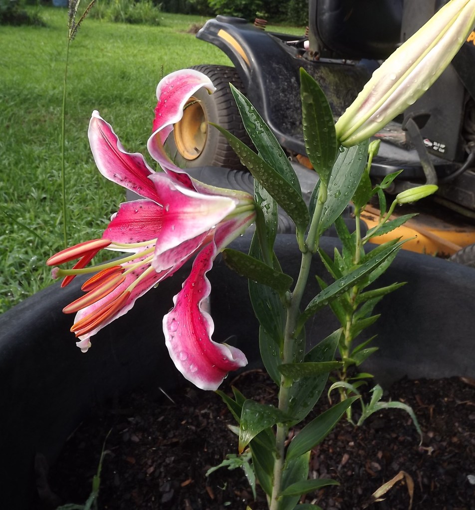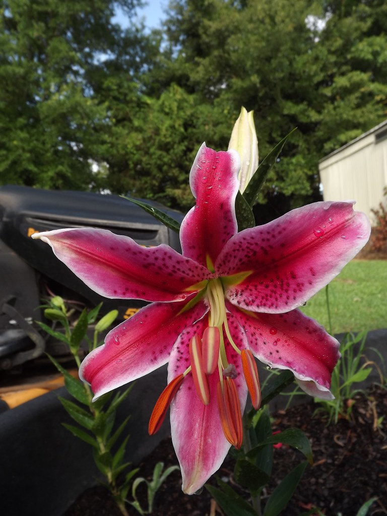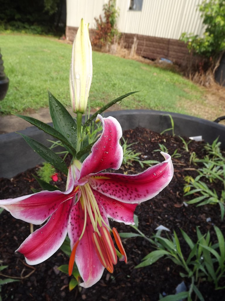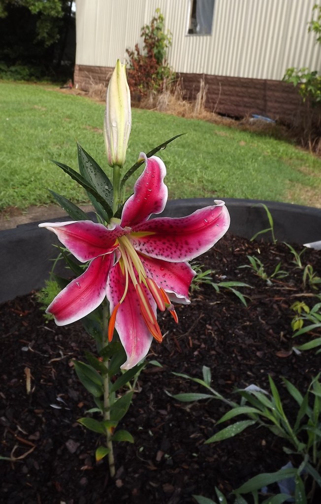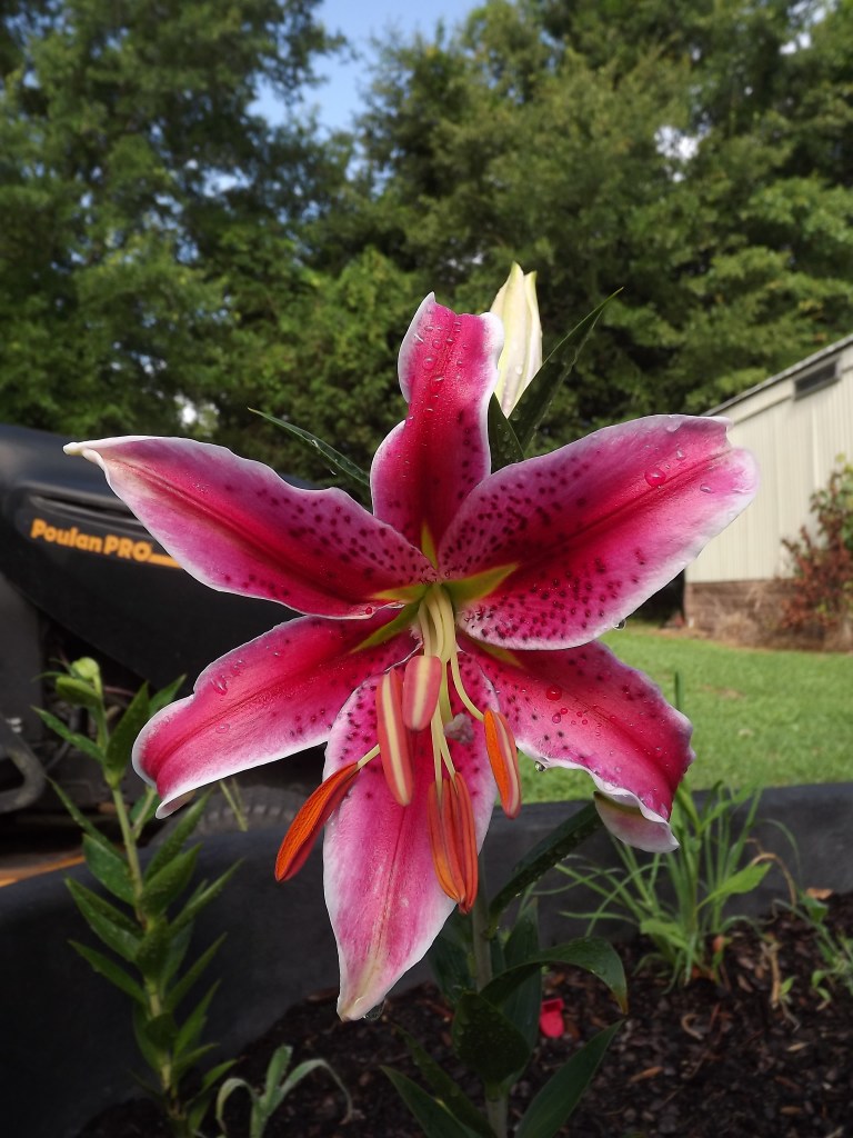 I have been waiting patiently for a particular lily in my yard to bloom. She has been watered and talked to and pampered more than any other plant in my yard. When my husband took the dog out this morning I heard him holler for me to come to the backyard. I threw on my clogs and out I went. He pointed to the particular lily in question. There she was…not partially open but in her full glory. Here are different shots of her for you to enjoy. Keep in mind this is a very large bloom approximately 6-8″ across.