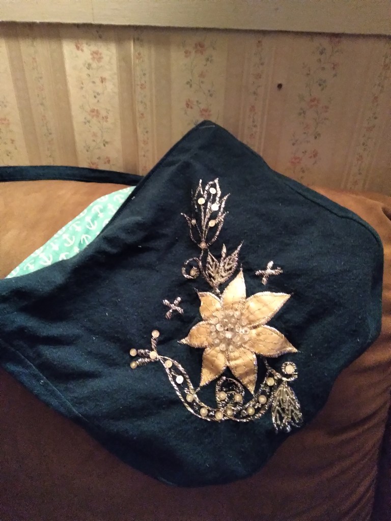 This piece of appliqued denim was formerly a section off the bottom of a midi skirt from the 80’s. The size of the applique dictated the size of the bag. After squaring off the block I rounded the corners at the bottom slightly. I then used this piece to cut the back and the lining sections. I then cut from the remaining denim I had about a two inch strip that would go about the bag section to form bottom and sides. Make sure you also cut this from your lining fabric. For strap cut another two inch strip for your desired length. Stitch the appliqued section and the matching back section to the side strip being careful to follow the curve at the bottom. For the strap, fold and stitch the length and turn. Press flat after turning and top stitch each side of the strap. Stich the strap ends between the denim and the lining. Folding the top of the denim and lining under, stitch all the way around the bag making sure you catch the straps in place.