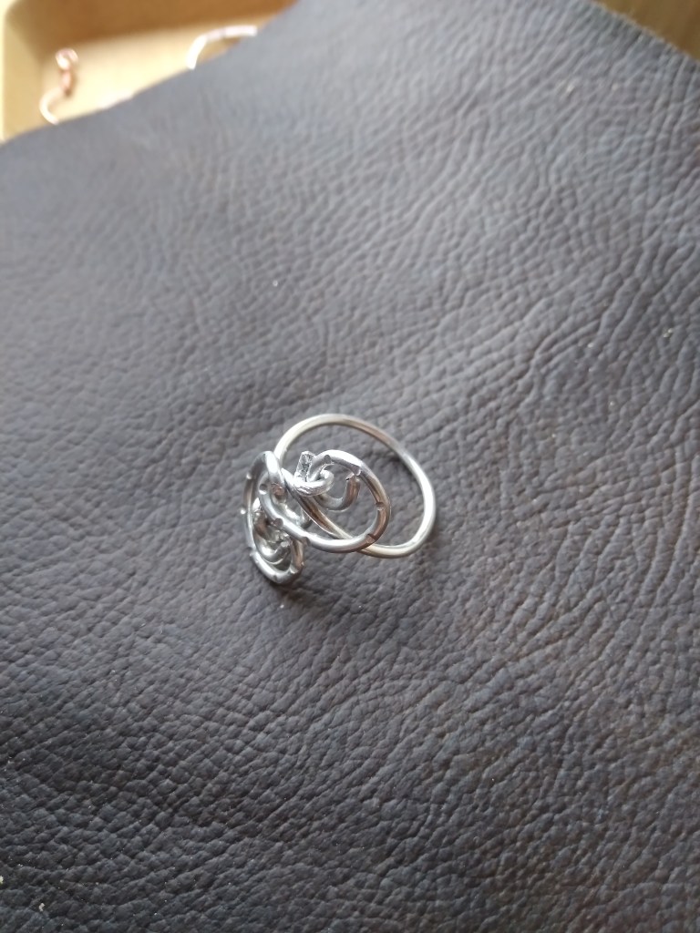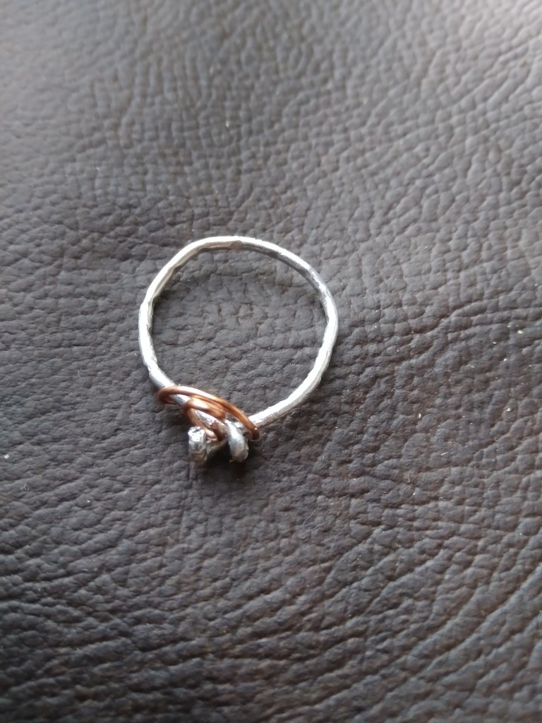 While this ring may look more complete it too was a recycled project. One of my biggest frustrations in using soft metals is the unwanted scratches and dents. To make them a little less noticeable I added a few dents of my own.