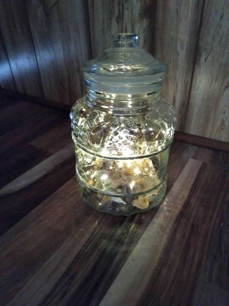 This particular one I made from a large mouth decorative jar. I found a large strand of fairy lights when I was checking out at Harbour Freight. This strand has 60 lights and a battery pack.