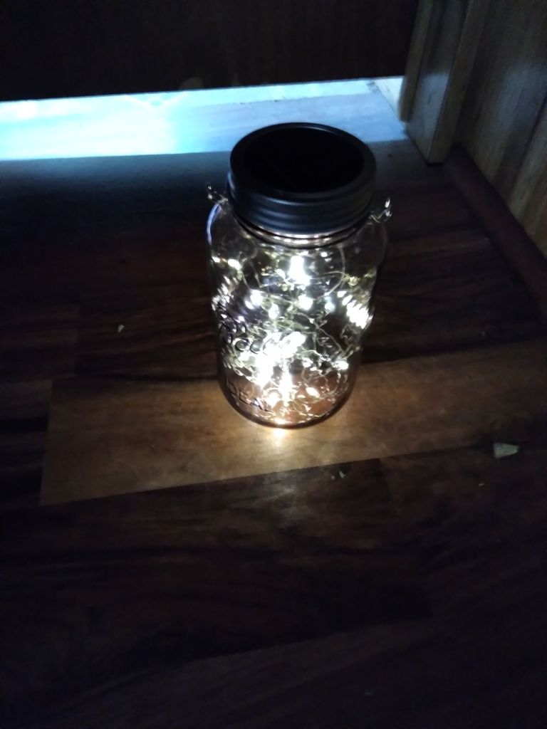 You don’t get the jar but you do get the solar caps on the left attached to about 30 fairy lights. I get great bargains on jars at local auctions. On the back side of the light you flip the power switch to on and pull the paper blocker out. Drop the lights into your jar and hook the wire handle around the neck of the jar. Now you can proceed to twist the cap on tightly.