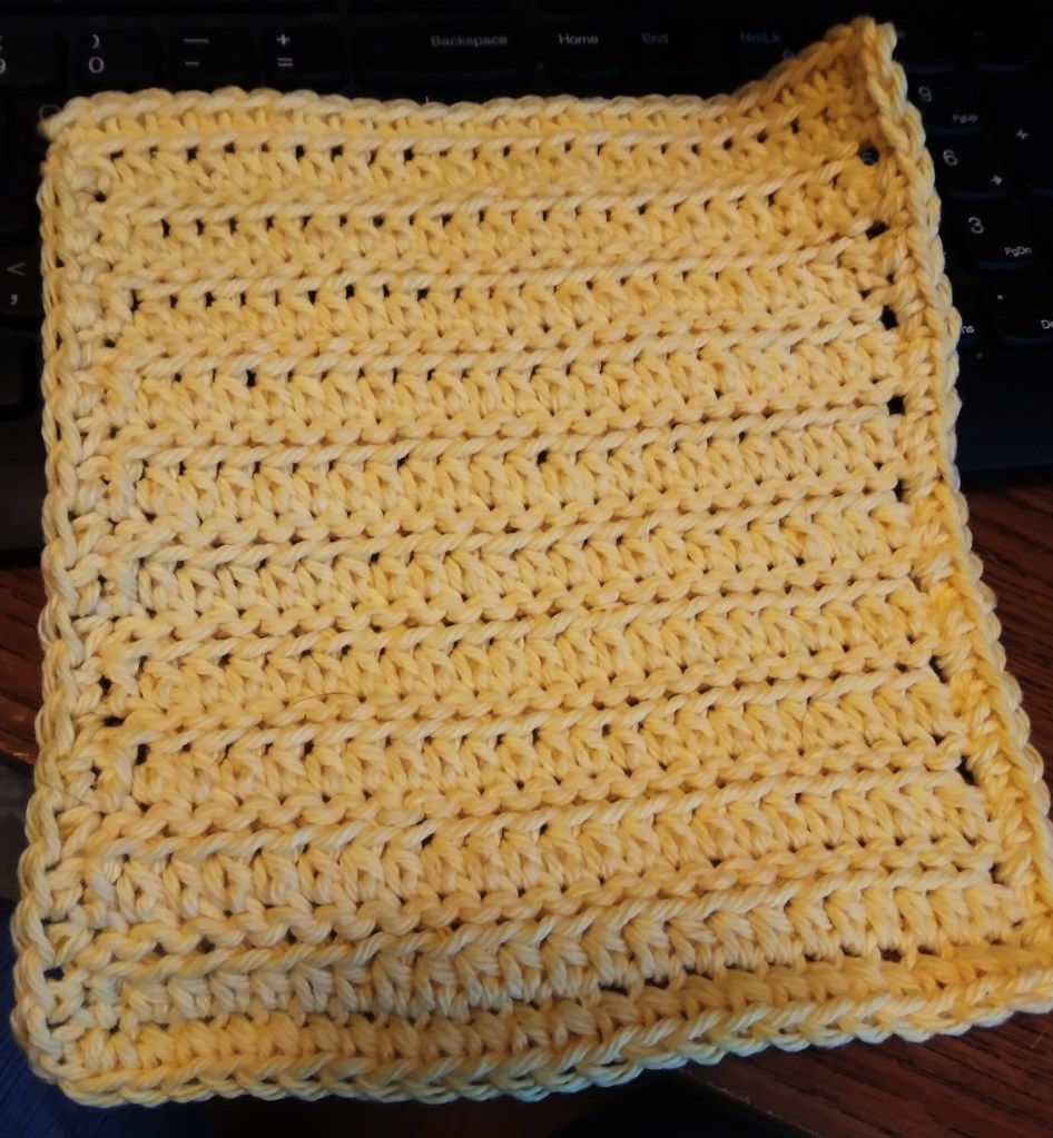 This one I simply call Lemon Drop because of the bright yellow yarn. To be more specific it is Lily Sugar’n Cream Yellow 2.5 oz skeins. This little skein will make at least two of these handy dishcloths.
