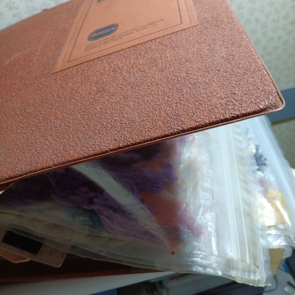 Sitting in what we affectionately call a “goodie box” underneath a table was this large binder full of thread and in the box was an array of cross stitch fabric, Scissors and more. I spent a whopping $5 for the box and the binder. The binder looked to be in poor condition so I really was not expecting the thread to be any good. In desperation one night when I failed to find a particular thread in my thread boxes I opened up the binder and quickly found the thread I needed. The thread was on a card that was enclosed in a zip lock bag carefully pulling a strand off the card I held my breath waiting to see if it was any good. On inspection the color looked good but was it weakened with age. I threaded my need and began stitching. Amazingly the thread seemed to be in good shape most likely because of the zip lock bag. On first inspection this binder was the one piece I thought I was going to have to throw out. So glad I didn’t.