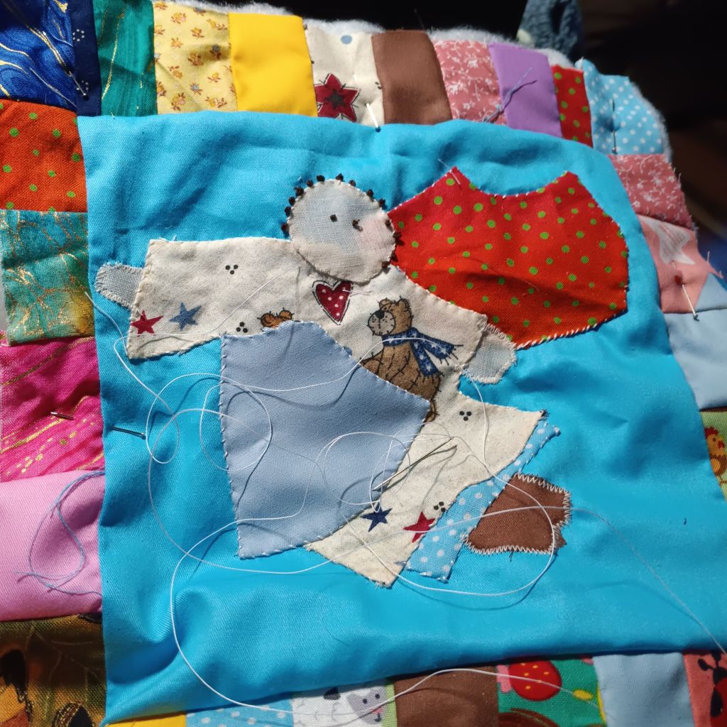 Today I have pieced this block together and I am ready to quilt it. The primary block contains a country angel (yes I know she is missing a mouth) that is appliqued mostly by hand. Today I added the smaller border blocks and am now ready to quilt. My stitch size varies based on the material and batting thickness. Today’s stitches are a little bigger than I normally do.