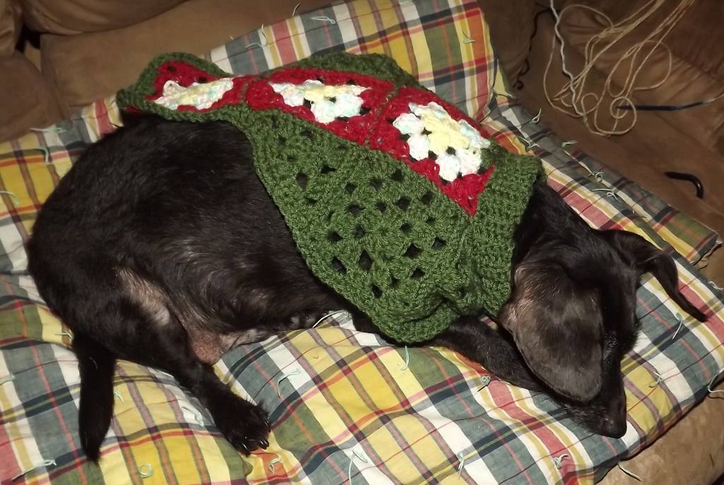 While my little man Roco was not very cooperative and sat down on the job, he is very cold natured so I made this simple sweater for him. The back and sides are made of granny squares and half squares sew together and then added a rib neck and trim.